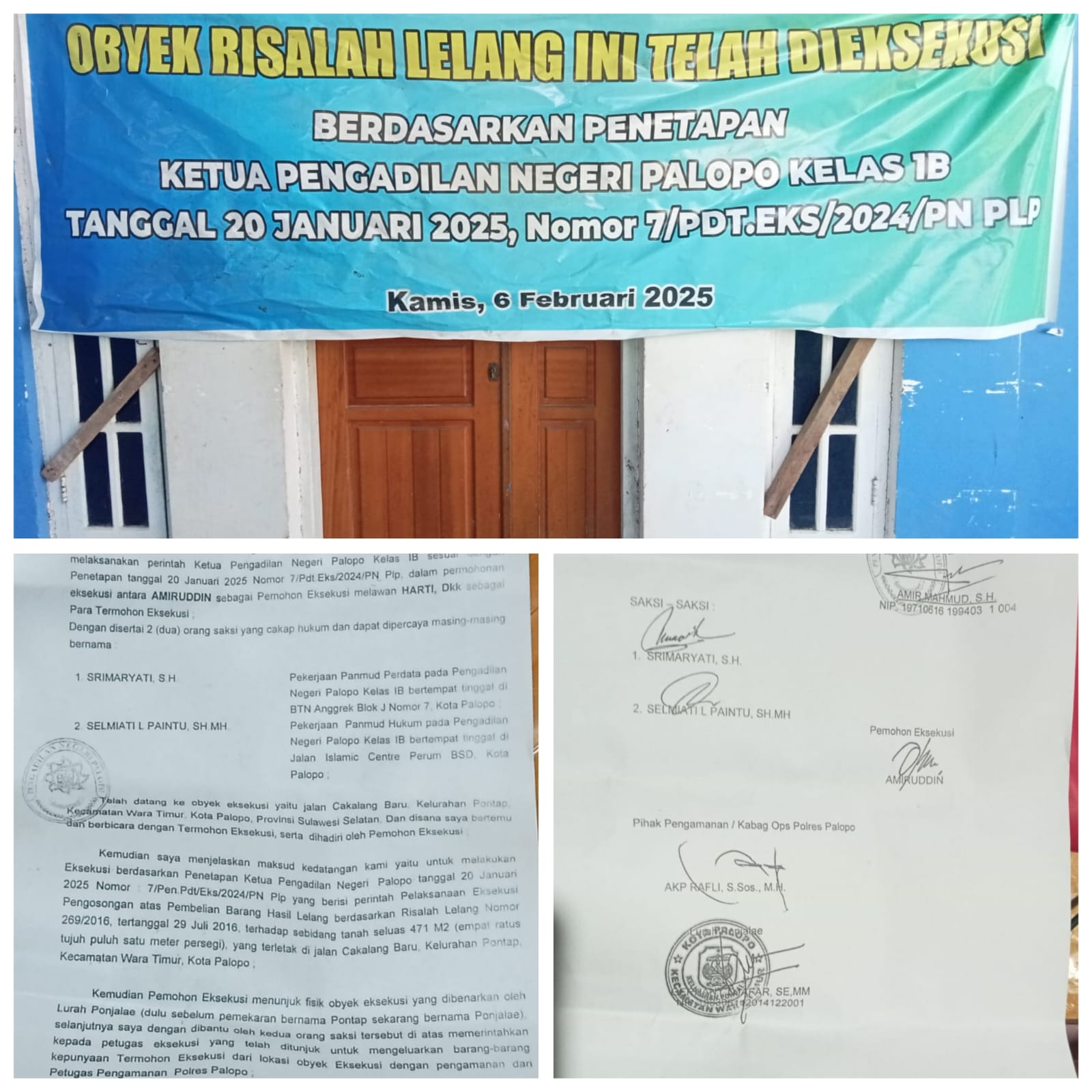 Dari realita fakta pelaksanaan eksekusi dari Pengadilan Negeri Palopo tersebut oleh Dua Orang Panitra Muda dari pengadilan Negeri Palopo yang mendapat perintah Ketua Pengadilan Negeri Palopo kepada Panitra AMIR MAHMUD,SH disertai dua orang saksi yang cakap hukum dan dapat dipercaya oleh SRIMARYATI, SH dan SELMIATI S.PAINTU, SH.,MH dikawal dari pihak keamanan Polres Palopo yang dipimpin oleh Kabag OPS AKP RAFLI, S.Sos.,MH serta disaksikan langsung oleh Lurah Salutellue Efhany Djafar, SE.,MM.