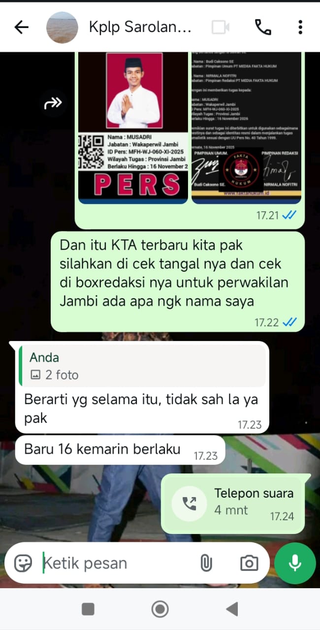 “Kami sudah kumpulkan dan jumpai wartawan di Sarolangun ngak ada yang kenal sama bapak, kalau mau datang aja kekantor Bawak identitas yang jelas”, tambah nya sambari menutup telpon.