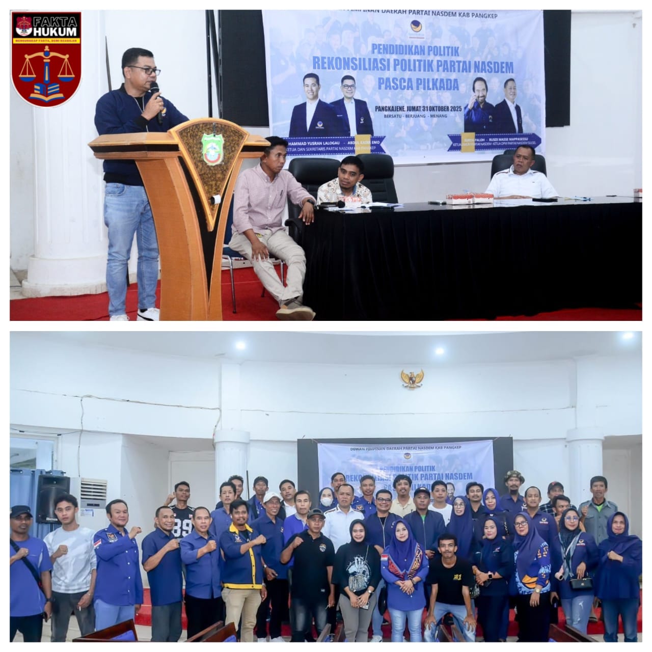 PANGKEP — Partai NasDem Kabupaten Pangkajene dan Kepulauan (Pangkep) menggelar kegiatan pendidikan politik dan rekonsiliasi pasca Pilkada di Ruang Pola Rumah Jabatan Bupati Pangkep, Jumat (31/10/2025). Kegiatan ini menjadi momentum penting bagi kader dan simpatisan NasDem untuk memperkuat konsolidasi serta merawat semangat kebersamaan setelah proses demokrasi daerah berlangsung.