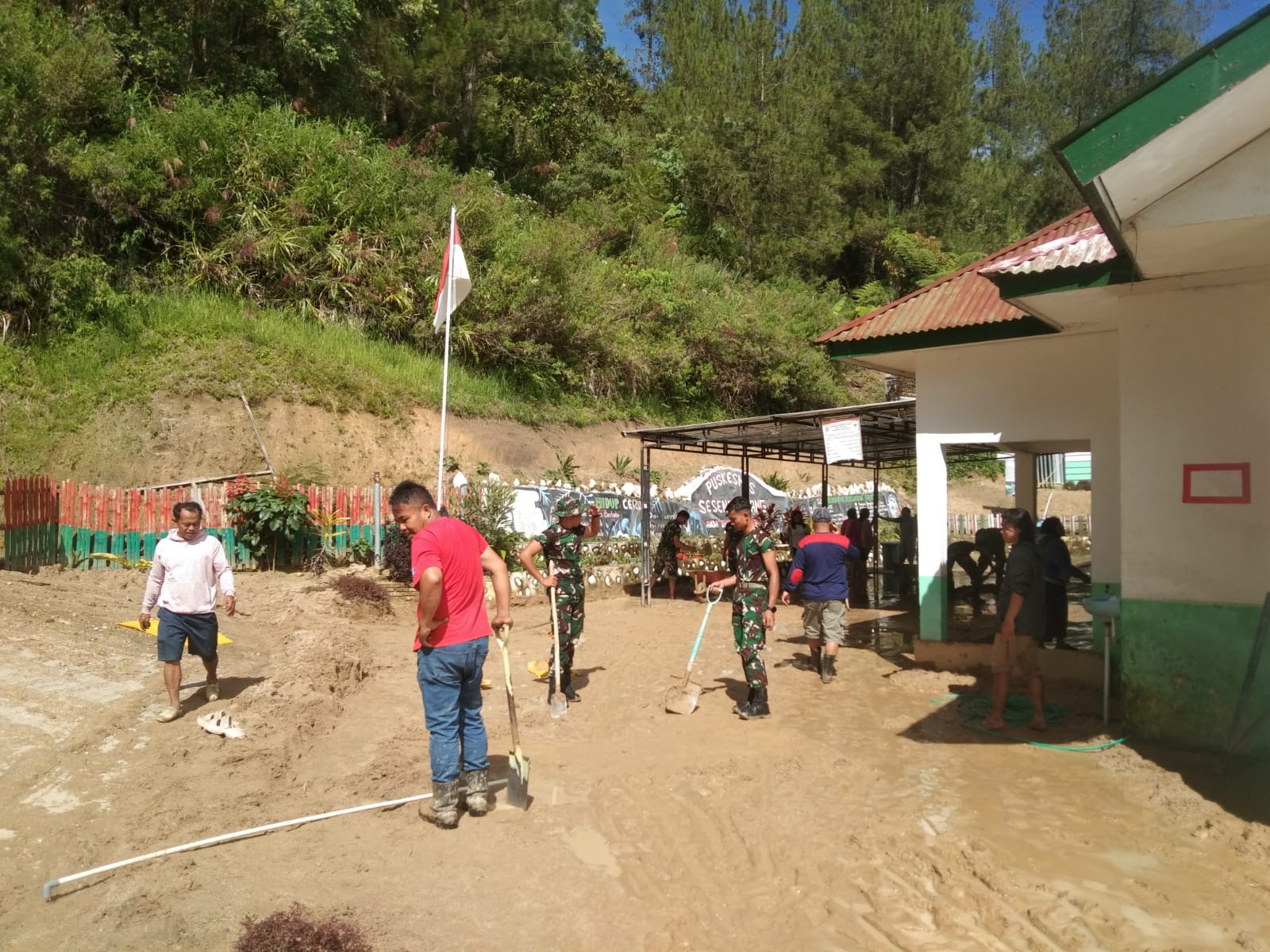 Serka Edy disela-sela kegiatan tersebut mengatakan bahwa tanah lumpur yang menutupi sebagian area Puskesmas Sesena Padang terjadi akibat hujan deras dengan intensitas yang tinggi mengakibatkan tanah lumpur menutupi sebagian area Puskesmas Sesena Padang. “Dengan alat seadanya, kami bersama pegawai Puskesmas dan dibantu masyarakat setempat bergotong-royong membersihkan lumpur yang menggenangi sebagian besar area Puskesmas” ungkapnya.