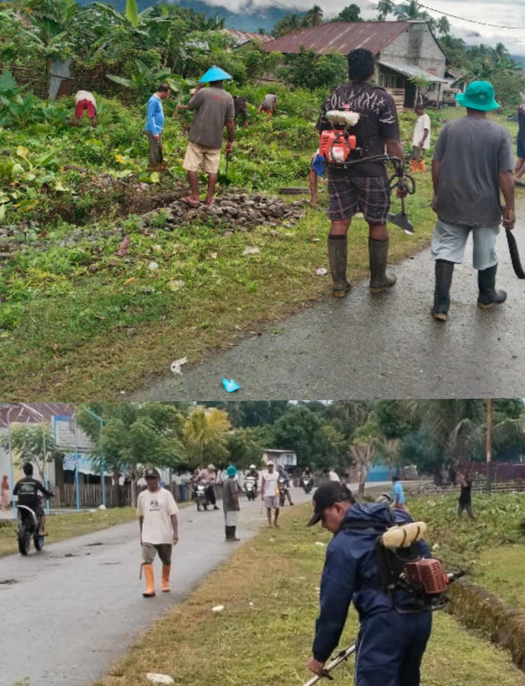 Kegiatan pada Jumat pagi ini dihadiri pula oleh Danpos Gane Barat Utara, Bripka Sulfi Munamad, yang bersama warga melakukan pembersihan di sekitar fasilitas umum dan jalan utama desa. Suasana gotong royong tampak hangat dan penuh kebersamaan, menunjukkan semangat warga untuk membangun lingkungan yang bersih dan sehat.