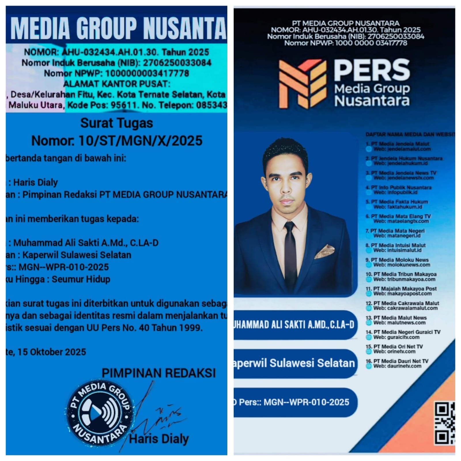 Amanah besar ini diberikan langsung oleh Direktur Utama PT Media Group Nusantara, Rusli S. Yusup, yang berkedudukan di Kantor Pusat Ternate, Maluku Utara, Jl. FITU, Desa/Kelurahan Fitu, Kec. Kota Ternate Selatan, Kota Ternate, Provinsi Maluku Utara, melalui surat mandat resmi No. 001/MGN-PUSAT/X/2025 kepada Muhammad Ali Sakti A.Md., C.LA-D (Kanda Ali).