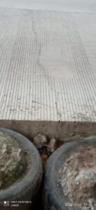 Beberapa bagian rabat beton tampak mengalami retakan memanjang, bahkan di sejumlah titik ditemukan kondisi patah yang cukup parah hingga menembus dari permukaan atas ke bagian bawah.