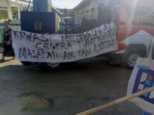 . Dalam aksi tersebut, warga menuntut agar perusahaan segera memenuhi hak dasar mereka berupa akses air bersih dan layanan listrik 24 jam yang hingga kini belum terpenuhi.